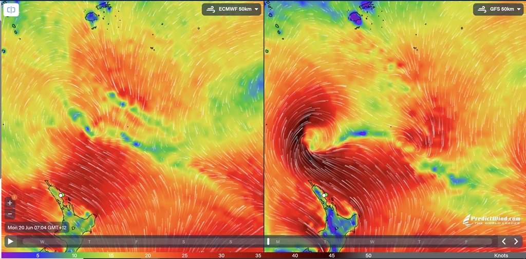 Fra Venerdì 10 e Domenica 11 le previsioni a lungo termine registrano un’anomalia a sud della Nuova Caledonia, fra le Vanuatu e le Fiji. I modelli previsionali cominciano a mostrare lo sviluppo di un sistema ciclonico che si sposta da Ovest a Est e che attraverserebbe quindi le rotte dalla Nuova Zelanda alle isole tropicali fra Domenica 19 e Lunedì 20 Giugno. Il sistema provoca una rotazione dei venti da Nord e uno sconvolgimento delle condizioni generali nell’area tropicale. Sistemi come questi possono essere pericolosi, in particolare quando dalle zone tropicali caldo-umide raggiungono aree temperate e più fredde. In pratica ci ritroveremmo a circa 3/4 del percorso con 25 nodi di vento in faccia, instabilità generalizzata con temporali diffusi anche violenti e altre amenità simili. Meglio evitare. Nostro malgrado anche la partenza del 14 sfuma, ad oggi 15 Giugno, nonostante i modelli ECMWF e GFS siano leggermente discordanti, l’area depressionaria è in arrivo sulla Nuova Zelanda la prossima settimana portando un bel ventazzo. Cominciamo ad avere la sensazione che a Marsden dovremmo fermarci più a lungo del previsto ![]()